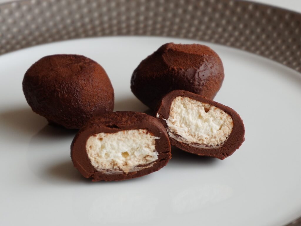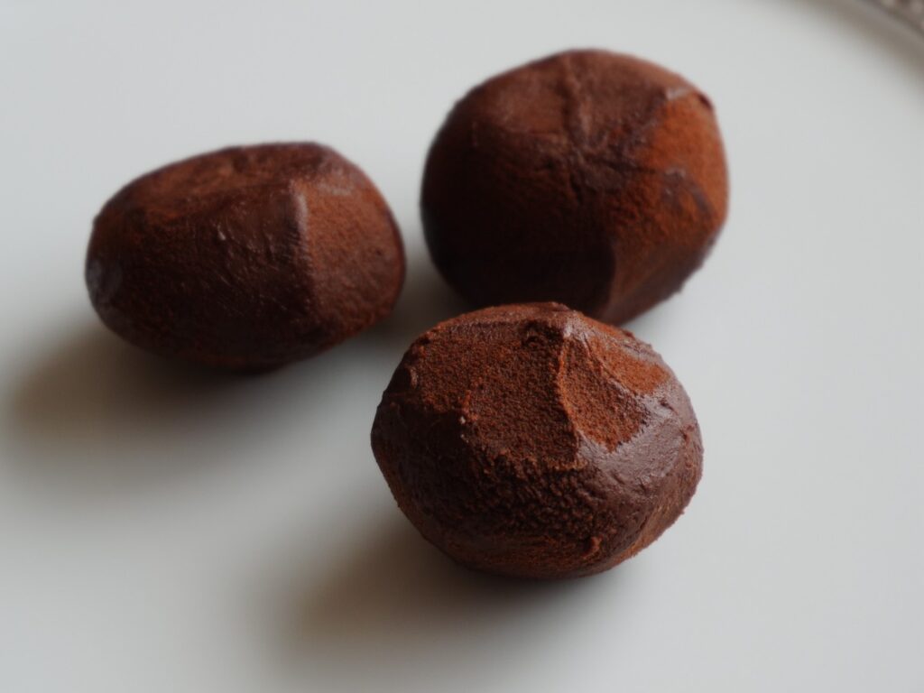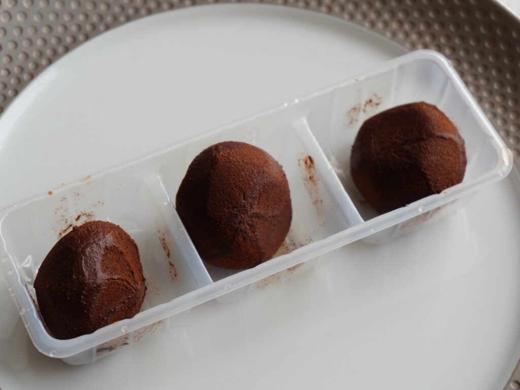 まず、パッケージを開封。シンプルな透明トレイに3個のトリュフが綺麗に並んでいます。表面はココアパウダーが薄く振りかけられ、ほんのり艶やかな茶色。直径約3cm程度の一口サイズで、手に取るとひんやりと冷たく、柔らかさが伝わってきます。