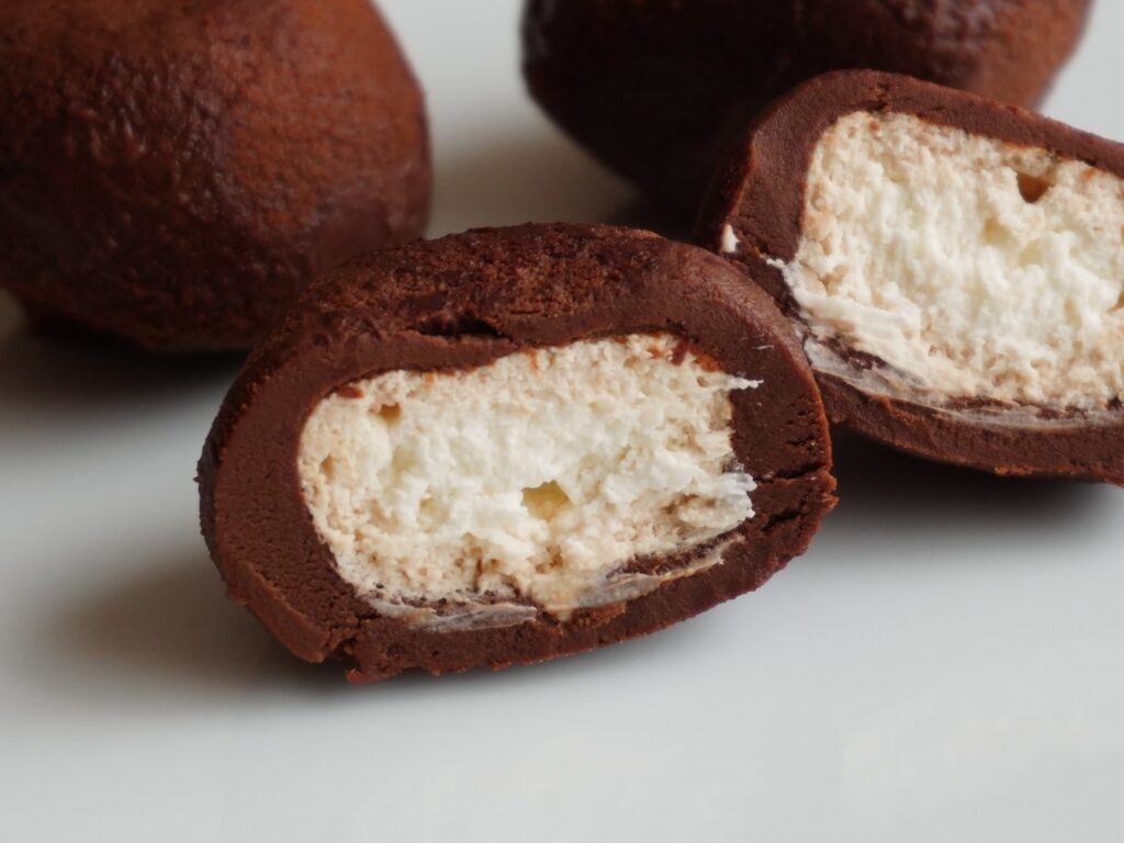 ナイフで半分に切ってみると、断面が美しい! 厚みのある生チョコの層が、ふわふわのホイップクリームを優しく包み込んでいる様子が視覚的にもたまらない。外側の生チョコは、ねっとりと濃厚。口に含むとすぐに体温で溶け始め、ビターなカカオの風味がふわっと広がります。