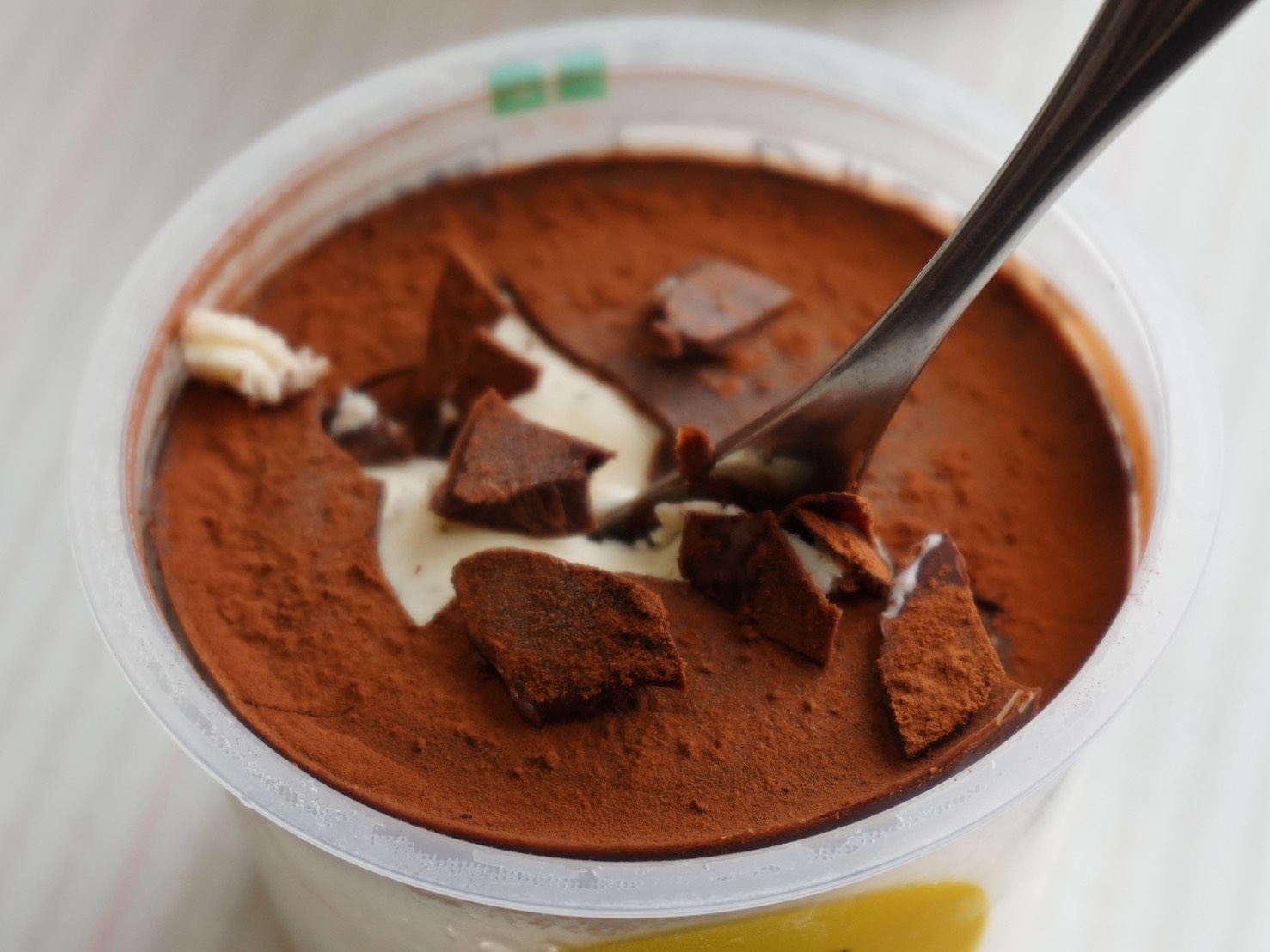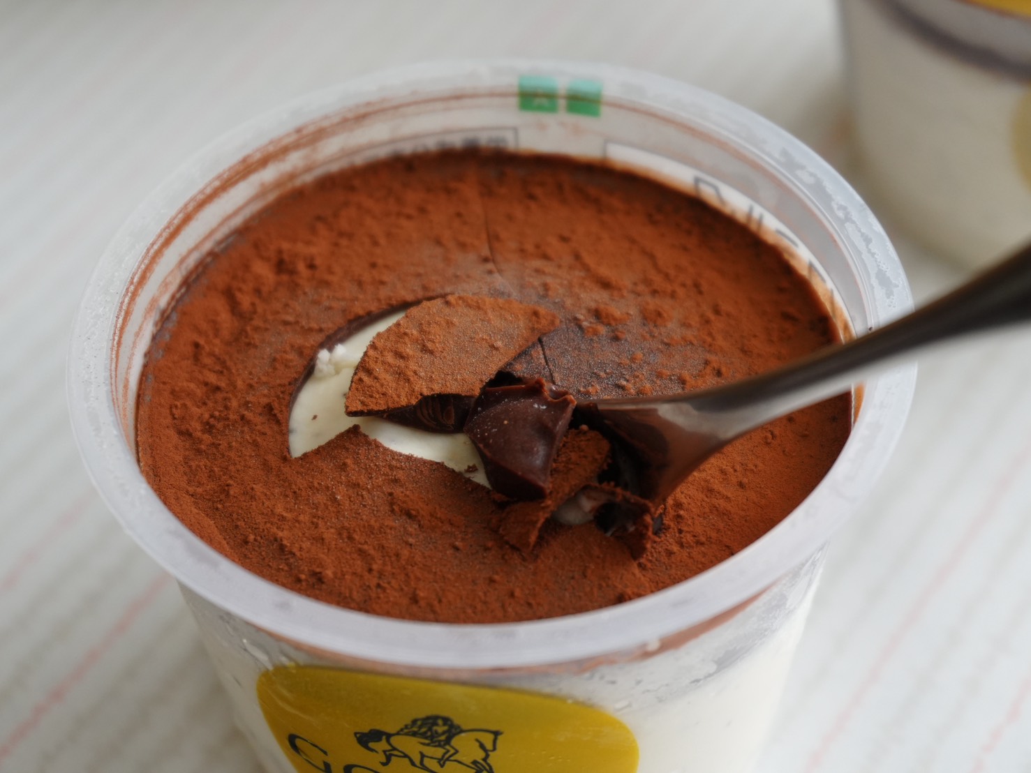 蓋の部分がすでにミルクチョコレートでコーティングされていて、表面にほろ苦いココアパウダーが薄く振られています。ティラミスらしさが視覚的にバッチリ出てる。