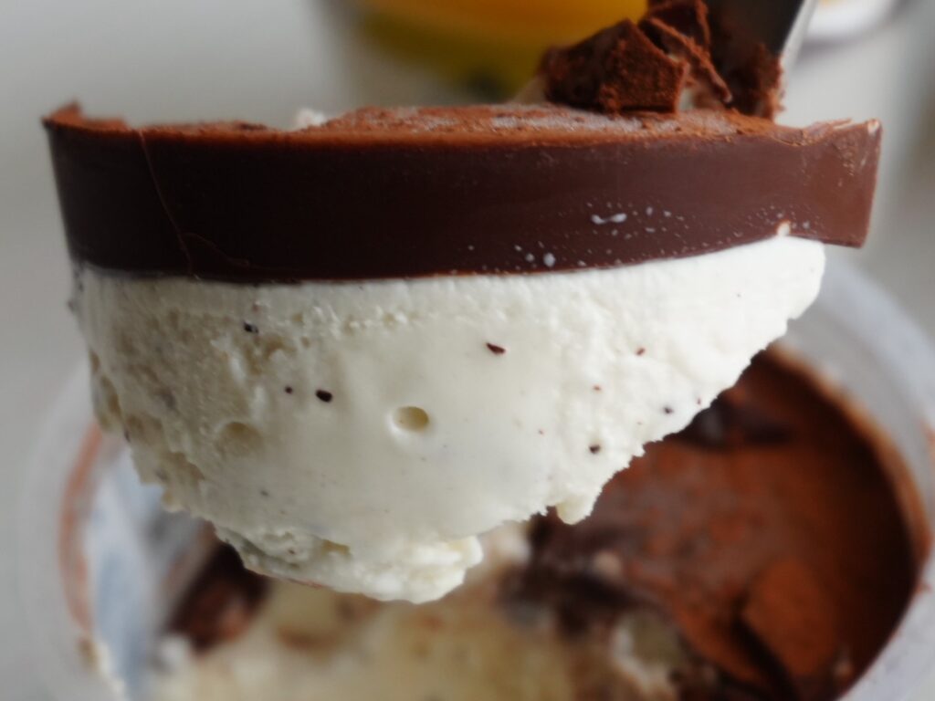 甘さは控えめで、チーズの酸味とコーヒーの苦味が絶妙に絡み合います。ティラミス本来の「コーヒー染み込んだレディフィンガー+チーズクリーム」のイメージを、アイスで再現してる感じでしょうか。