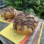 ココアを練り込んだコロネ生地に、チョコレートコーティングし角切りアーモンドを乗せてます。