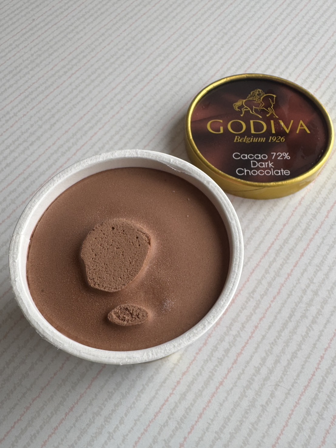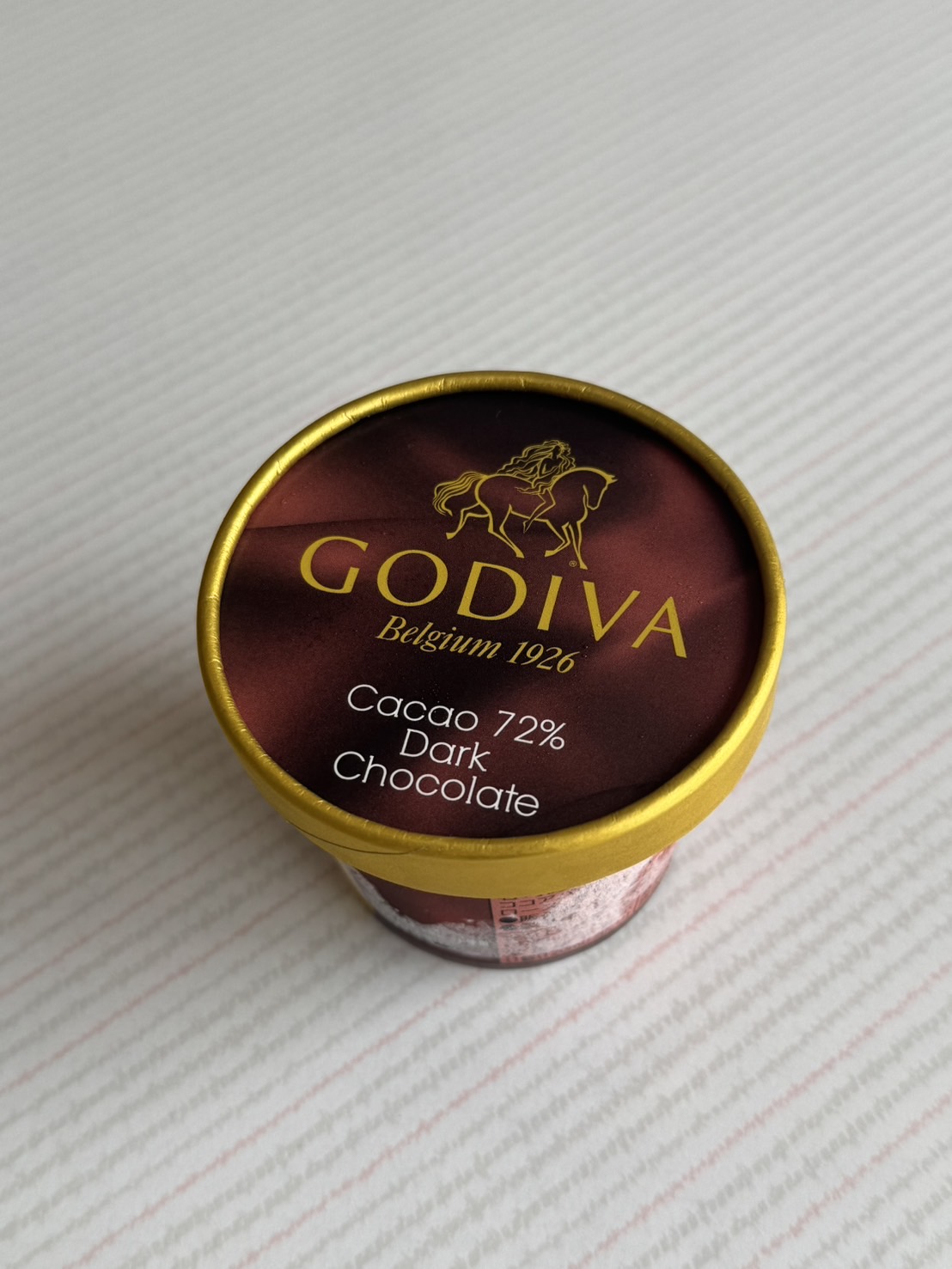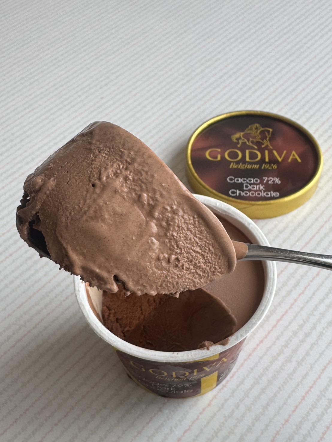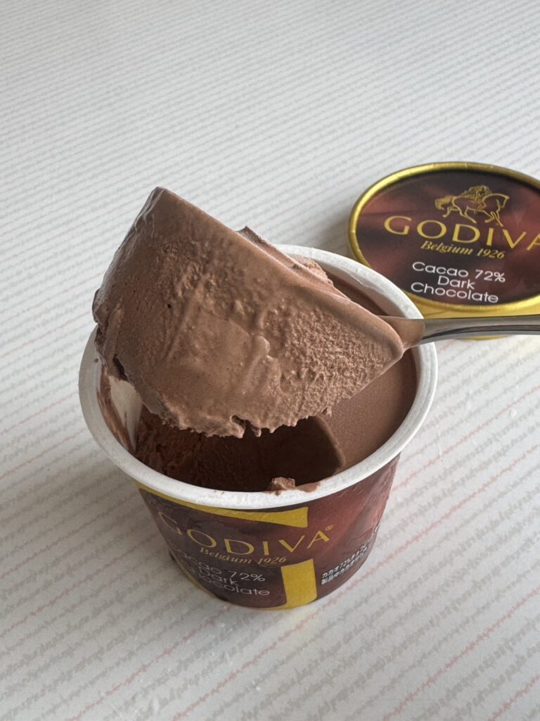 ゴディバのカップアイスクリーム『カカオ72%ダークチョコレート』は、ビターなカカオの魅力を存分に引き出した、まさに大人のためのデザート。パッケージはゴディバらしい洗練されたデザイン。深みのあるブラウンのカップで期待が膨らみます。