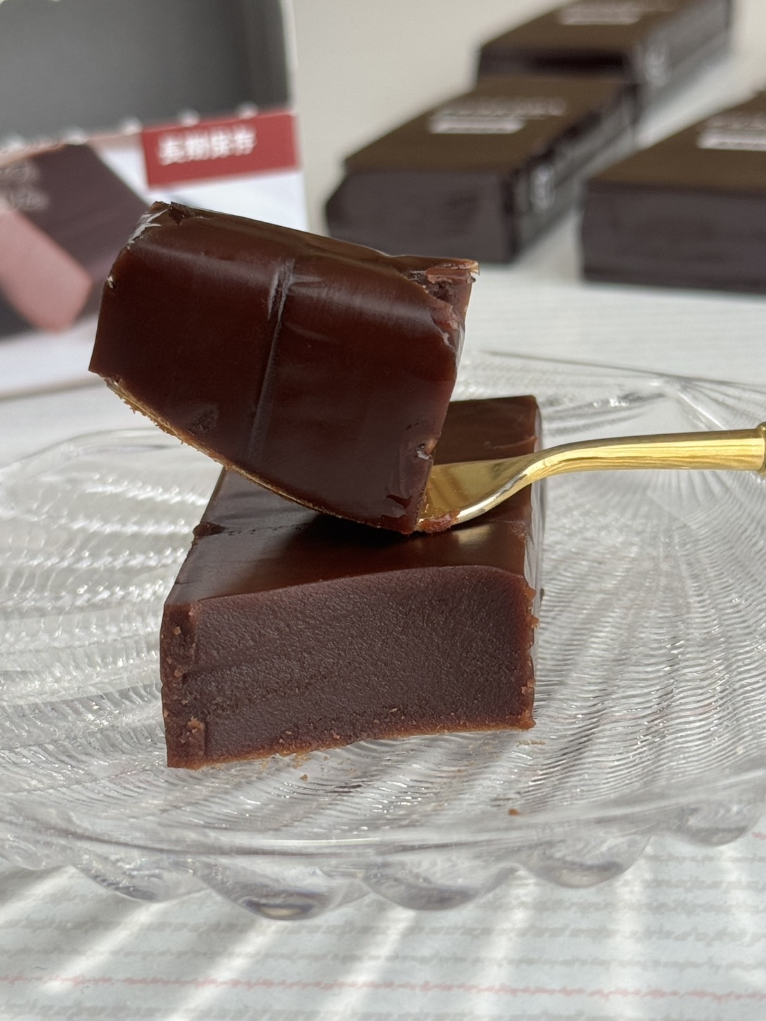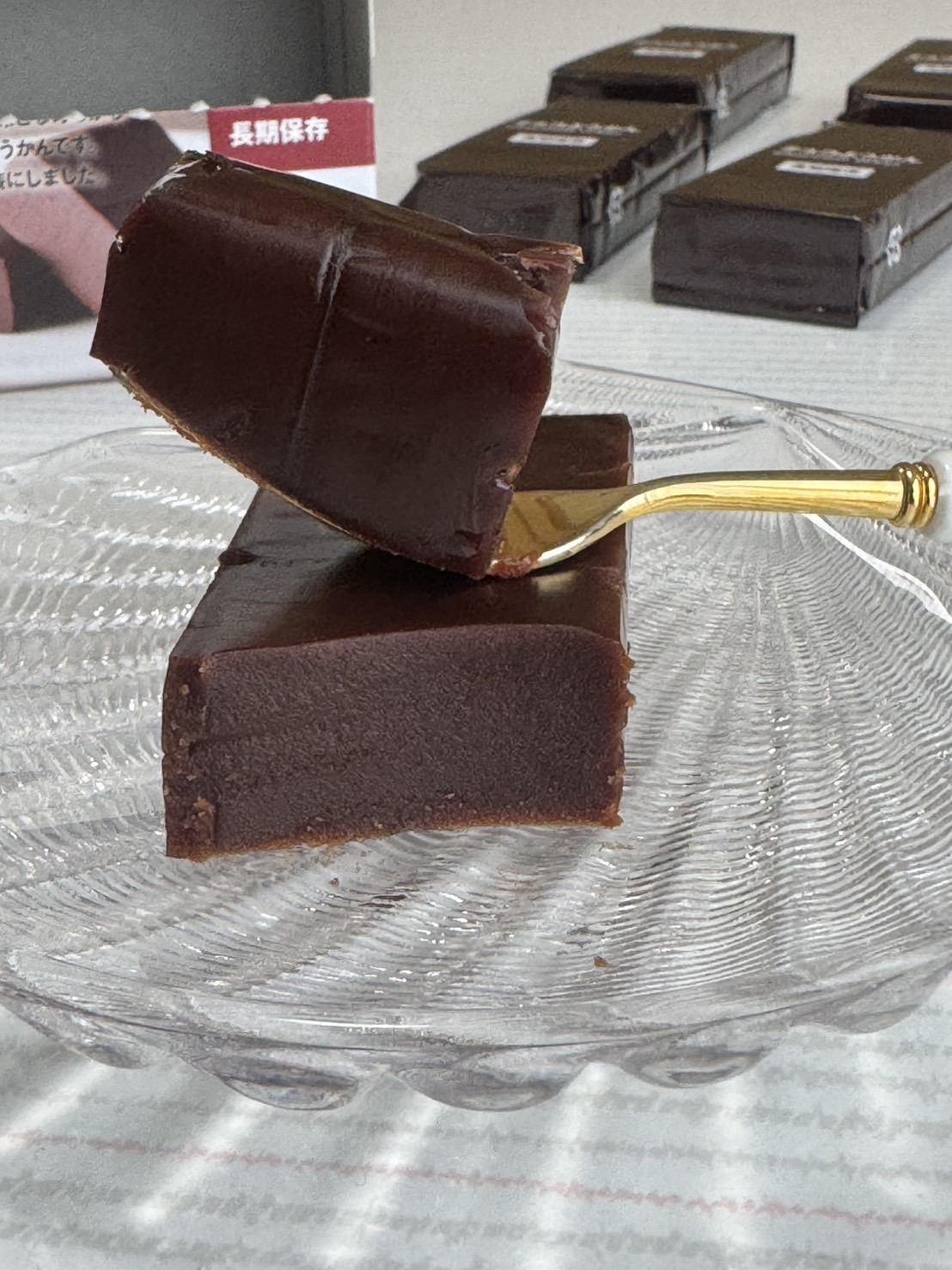 一口目をフォークで口に運ぶと、滑らかな舌触りがまず印象的。羊羹のねっとり感とチョコレートのシルキーな質感が溶け合い、まるでガナッシュのような贅沢な口当たりです。味の展開は実に魅力的。最初に広がるのは、優しいカカオの風味。以前より軽やかで親しみやすい甘さを生み出し、苦味が後味に残らずすっと消えていく。