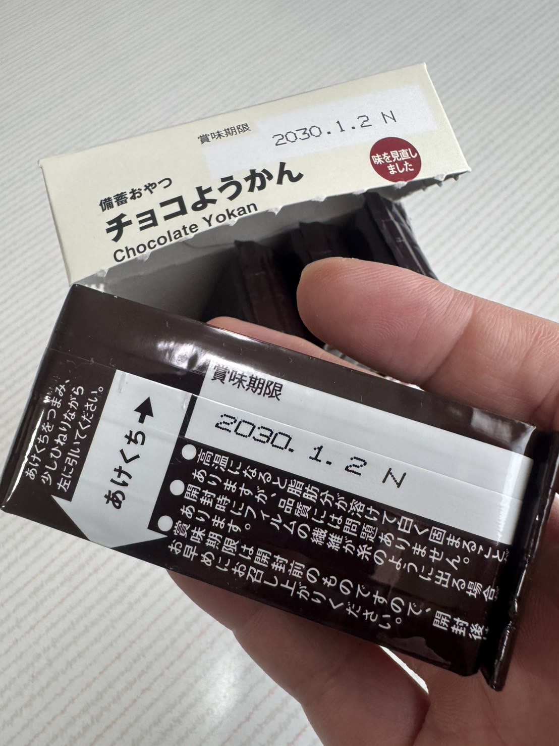 無印良品から『チョコようかん』が新発売されました。味を見直してさらに美味しくリニューアルされたとのこと。長期保管が可能で、非常食としても頼れる存在です。和菓子の伝統とチョコレートのモダンな魅力が融合した一品。パッケージを開ける前から、無印良品らしいミニマルな美しさに心が惹かれます。手で持つと意外にずっしり重いです。