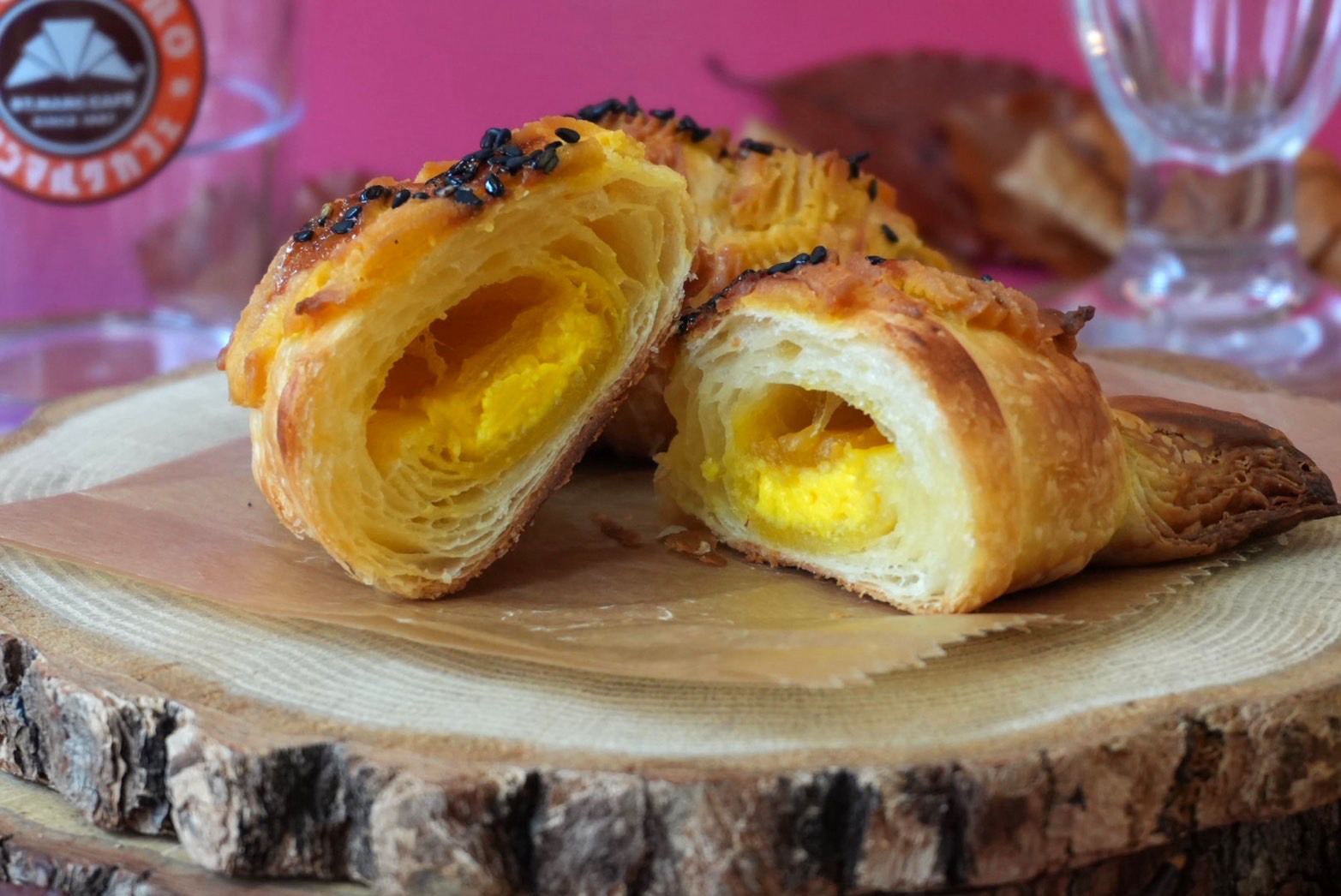 味だけでなく食感のコントラストも魅力です。外側のクロワッサンは、焼きたてならではのサクサク感が際立ち、中に詰まった安納芋クリームとチョコレートのしっとりとした質感が加わり、黒ゴマのプチプチ感もアクセントとして地味に効いています。