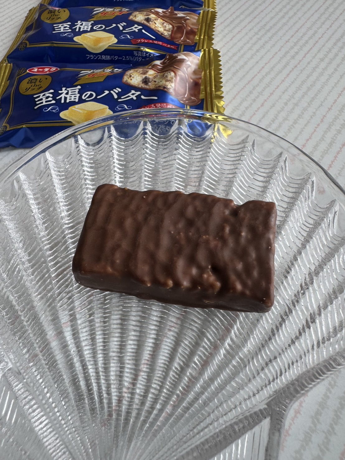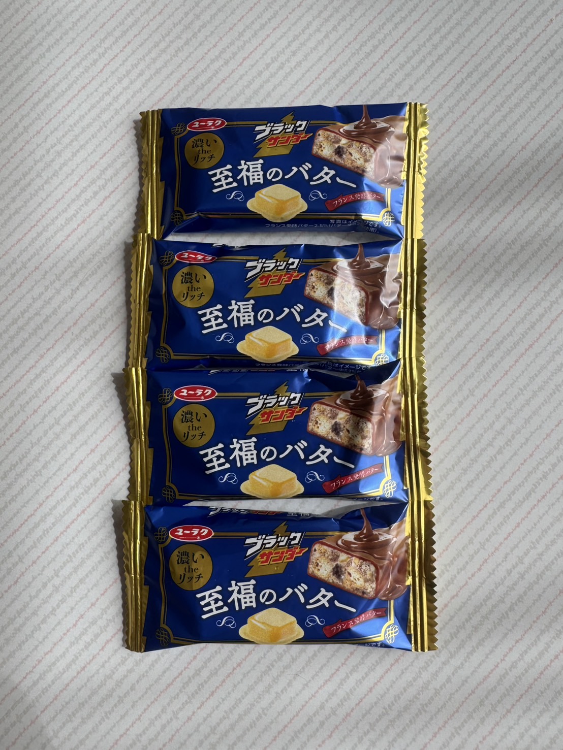 パッケージはブラックサンダーらしい黒ではなく、メタリックなブルーカラー。至福のバターといえばブルーですね。濃いtheリッチも文字など、昔のブラックサンダー至福のバターと比較すると少しデザインが変化しました。