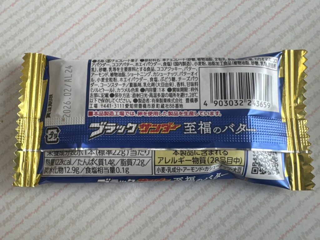 まず、基本スペックから。ブラックサンダー至福のバターは、元々2020年に登場した人気のプレミアム版ですが、今回のリニューアルで「濃いtheリッチ」シリーズとして生まれ変わりました。価格はコンビニで64円(税込)です。リニューアル前と価格が変わらず企業努力が感じられます。内容量は1本あたり約22gと、手軽に持ち運べるサイズ感。最大のポイントは、焦がしバターの含有量を10%増やしたこと。これにより、従来のクッキー主体の食感に、バターの深いコクが加わり、全体がよりリッチにシフトしています。