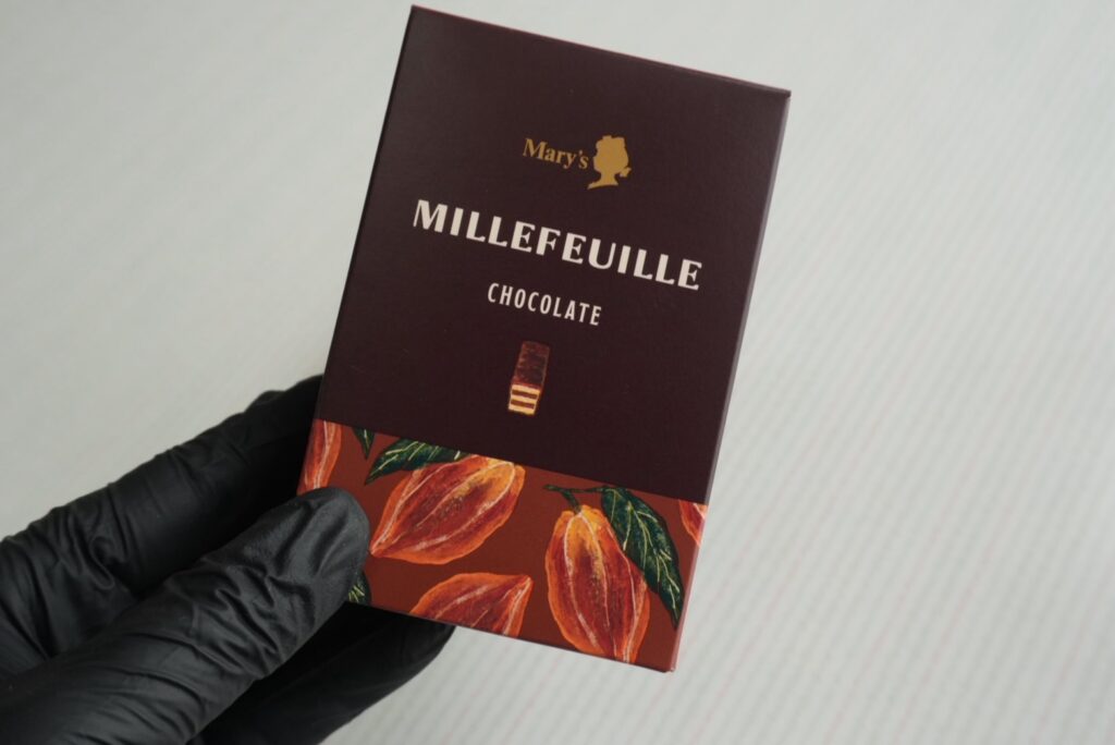 ミルフィーユの箱は、焦茶を基調にしたシンプルで上品なデザイン。カカオの絵もプリントされおしゃれです。スリムな箱は、棚に並んでいても目を引く美しさ。