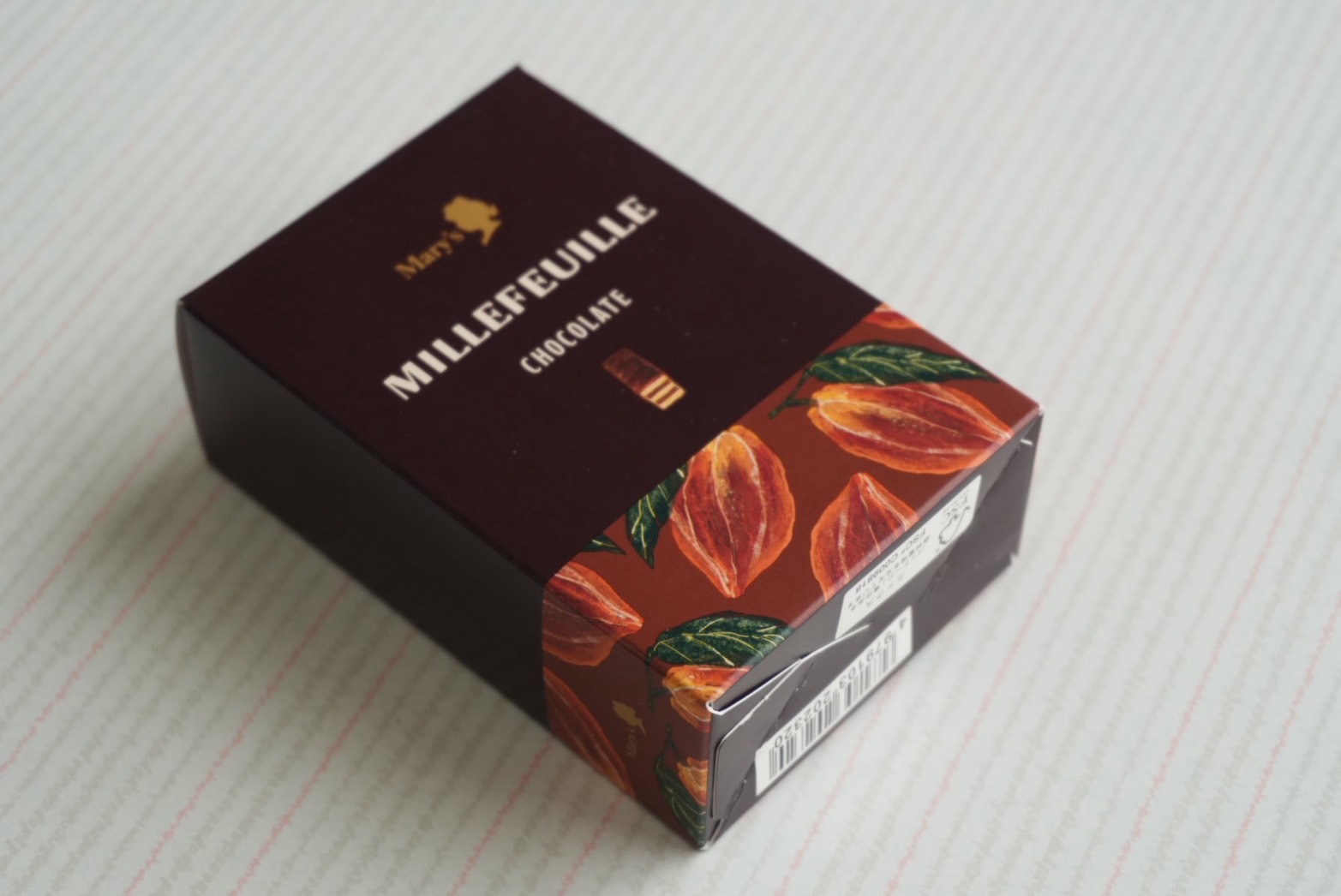 ミルフィーユの箱は、焦茶を基調にしたシンプルで上品なデザイン。カカオの絵もプリントされおしゃれです。スリムな箱は、棚に並んでいても目を引く美しさ。