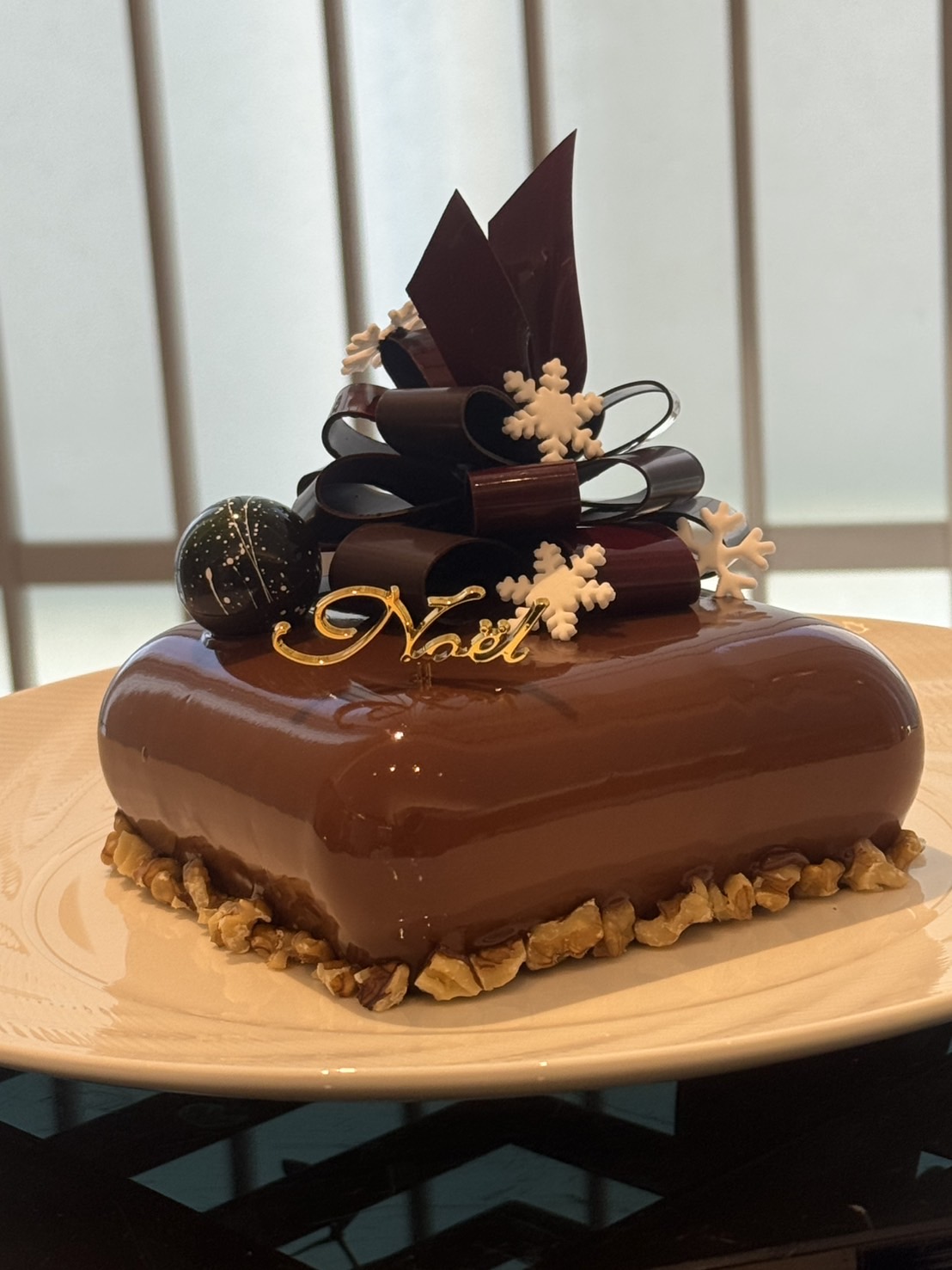 ケーキの内部は、キャラメルショコラムースとショコラムースを丁寧に重ね、エスプレッソの濃厚な風味を染み込ませた構造。メープル風味のクレームブリュレが加わることで、まろやかな甘さが広がり、口どけの良さが際立ちます。オークラ東京のペストリーシェフたちの細やかな仕事ぶりが光る、大人向けのクリスマスケーキです。
