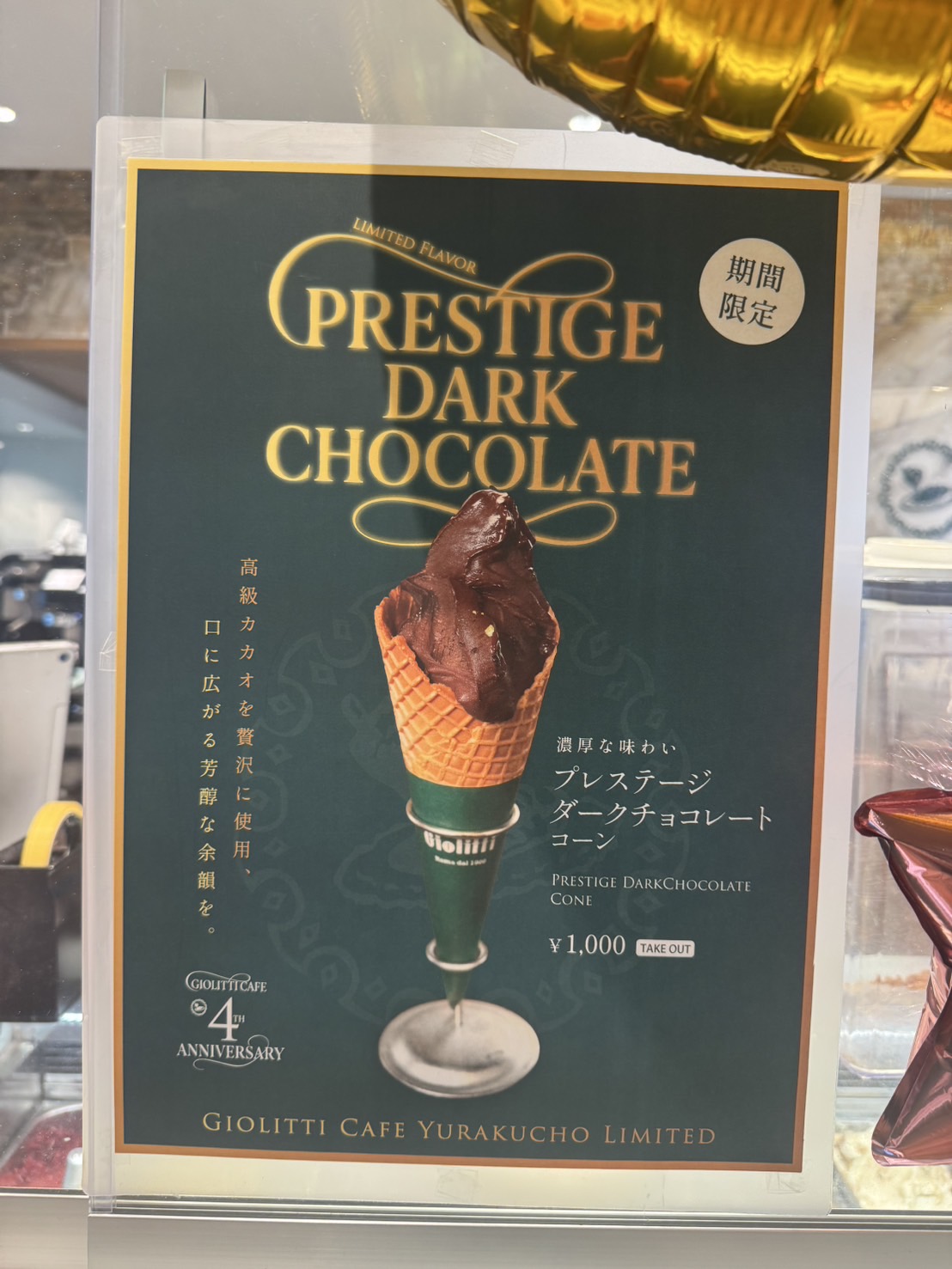 東京店舗の1つ「Giolitti Cafe 有楽町マルイ店」が4周年を記念して限定フレーバー『プレステージダークチョコレート』を販売されてます。