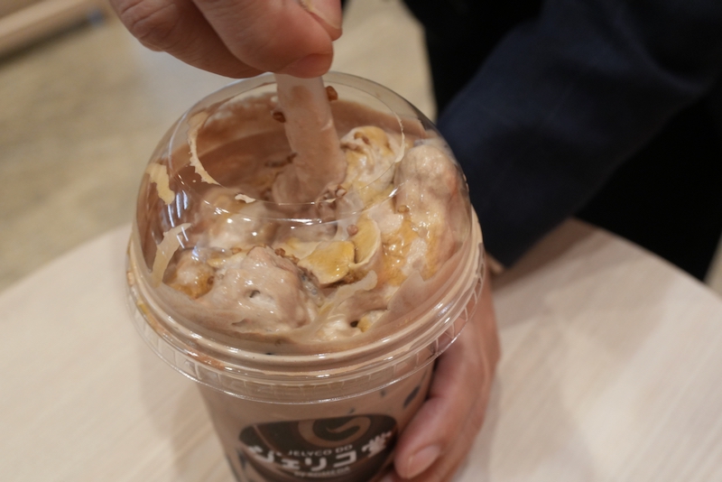 私はチョコレートの専門家なのでチョコ系でカスタマイズ!ミルクココアをベースに、ホイップはチョコを選択。トッピングは玄米あられ、黒みつを組み合わせたカスタムを注文。底には標準仕様のコーヒージェリーが敷かれています。