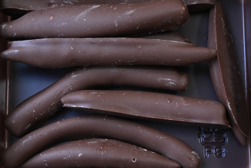 スティックは均一で、チョコの厚みもそろっており、光の反射が一定。薄いコーティングで仕上げていることが見た目からもわかります。