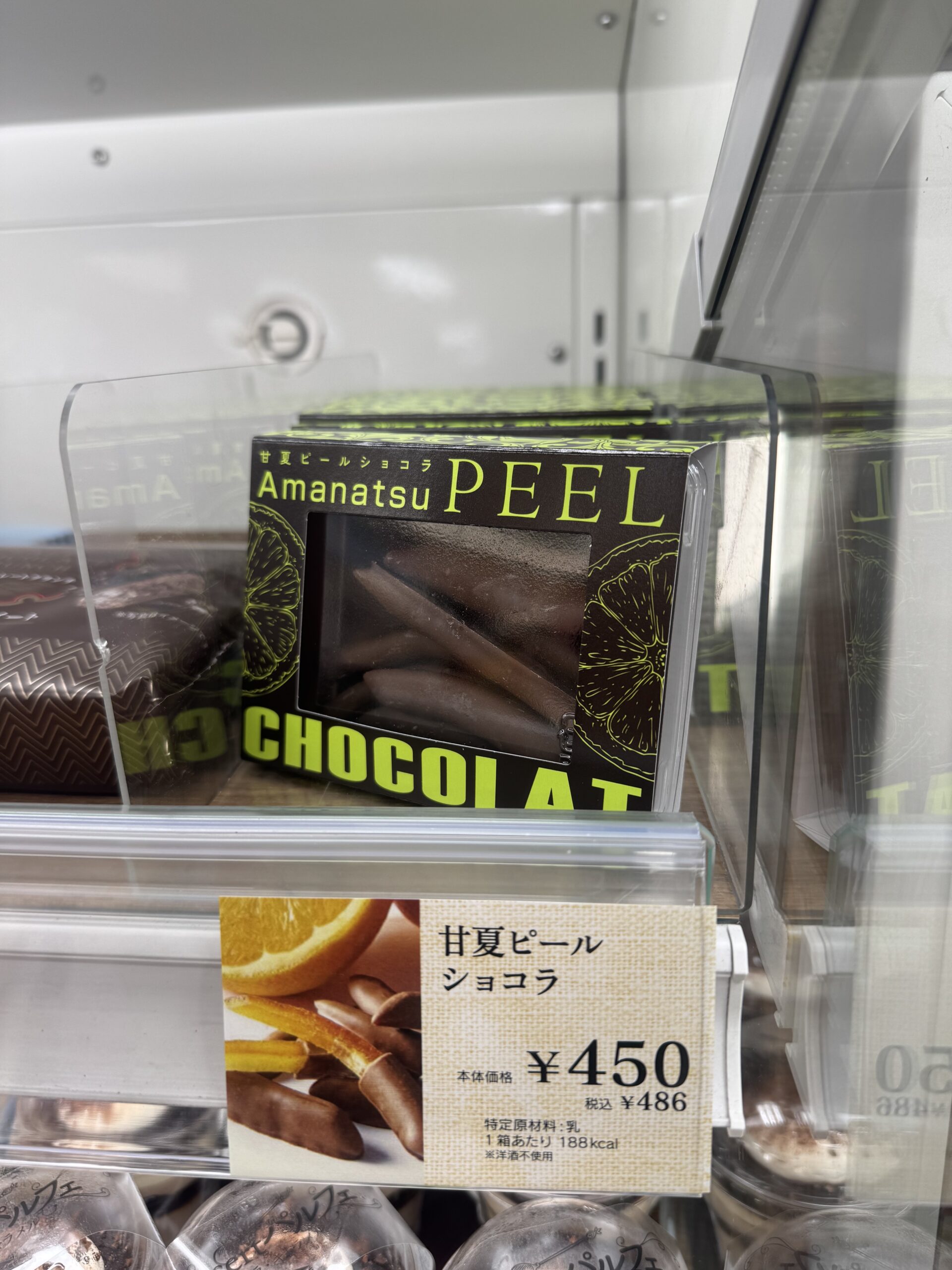 甘夏ピールショコラは、派手さのない菓子ですが、味の組み立てが整っています。薄いミルクチョコで甘夏の苦味と香りを包むことで、甘さに流されない“柑橘の良さ”がしっかり残る仕上がり。後味は軽く、香りの抜けもきれい。