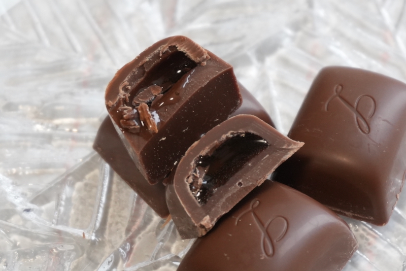 ひと口目はミルクチョコの柔らかな甘さがはじめに舌へ届きます。表面はしっかりとした硬さがあり、噛むと静かに割れて、中のシロップがゆっくり広がる構造。どろっと流れ出るような柔らかさがありつつ、口の中であわさっていくと外側との一体感があります。断面を確かめたくなりますが、シロップがこぼれたり手につく恐れがあるので一口でいただきましょう。