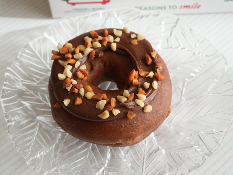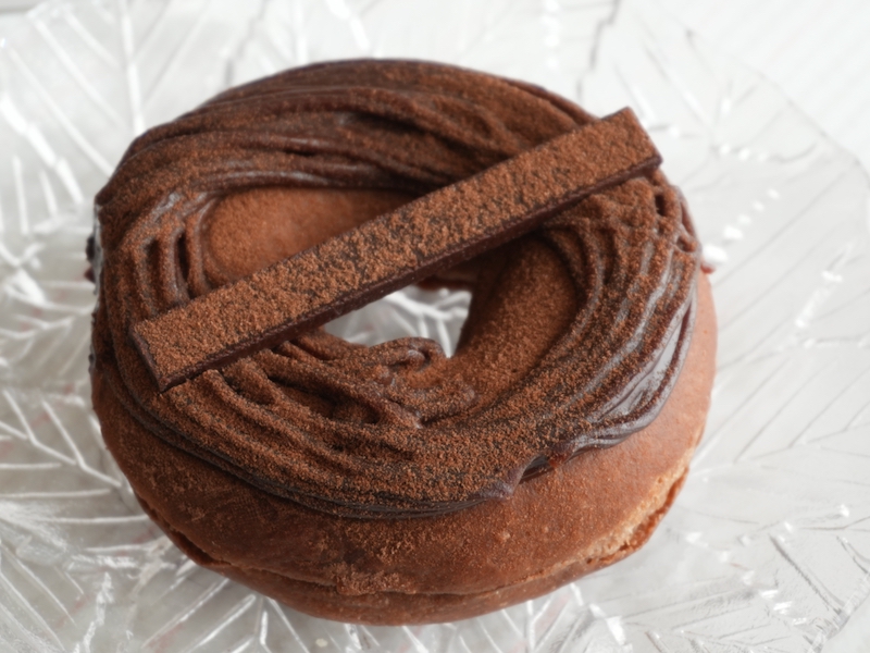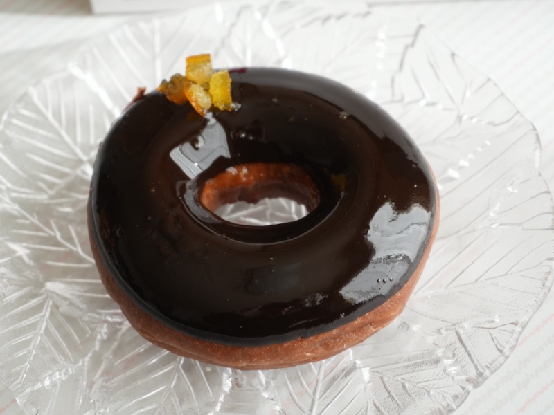 チョコ生地をベネズエラ産カカオマス入りのビターチョコでコーティングし、オレンジナパージュを重ね、オレンジピールダイスをトッピング。オランジェットをドーナツに落とし込んだ設計です。