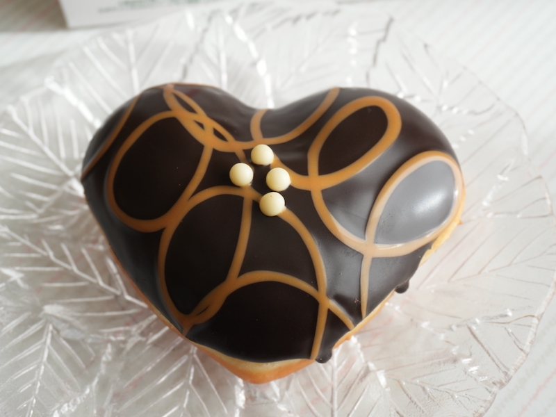 ハート型のチョコ生地に、ベネズエラ産カカオマス入りのビターチョコをコーティング。キャラメル風味のラインとシリアルチョコの飾りで、見た目から“ご褒美感”が強い一品です。中にはベルギー産チョコ入りクリームが入っています。