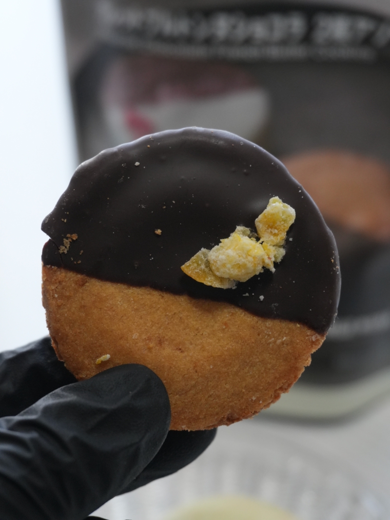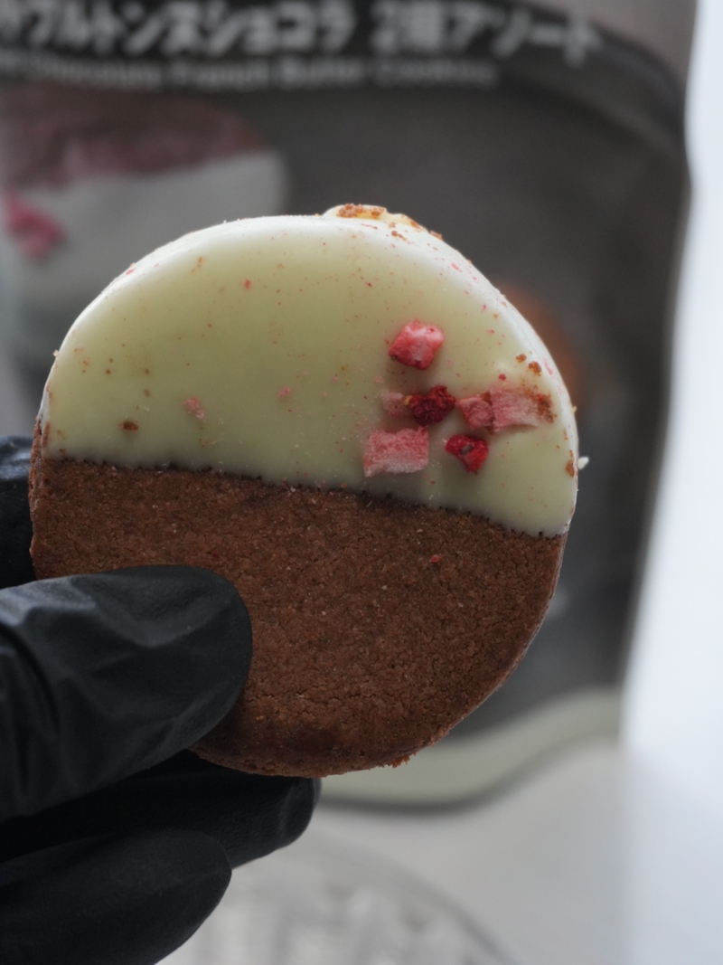 袋には2種のガレットブルトンヌが入ってます。プレーン生地にチョコレートをかけてオレンジをトッピングしたものと、チョコ生地にホワイトチョコレートをかけてストロベリーをトッピングしたもの。価格は税込590円。2個入りなので、ひとりで食べ比べてもいいし、ちょっとした差し入れにも収まりがいいサイズ感です。