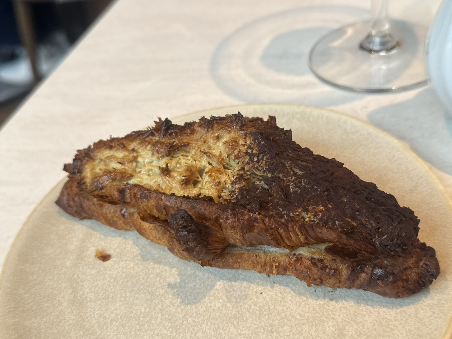 口に入れた瞬間、クロワッサンの層がほどけるようにサクッと砕けます。次の瞬間、上にのったカダイフ入りの塊がザクッと反撃してきて、食感が一気に立体になります。似たような“サクサク”でも、層の薄さと、粒の細かさは別物。二種類の軽さが重なって、噛むたびに楽しさが続きました。カダイフとクロワッサンのリズミカルな食感同士の相乗効果が素晴らしい。