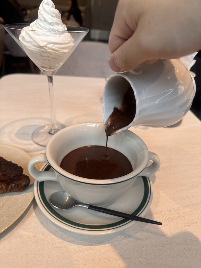 クロワッサンを食べ終えたら、余ったホイップクリームをショコラショーを合わせて飲むと2度美味しい。まろやかな味わいに変化します。