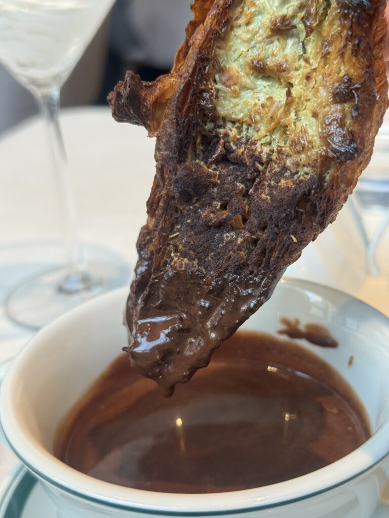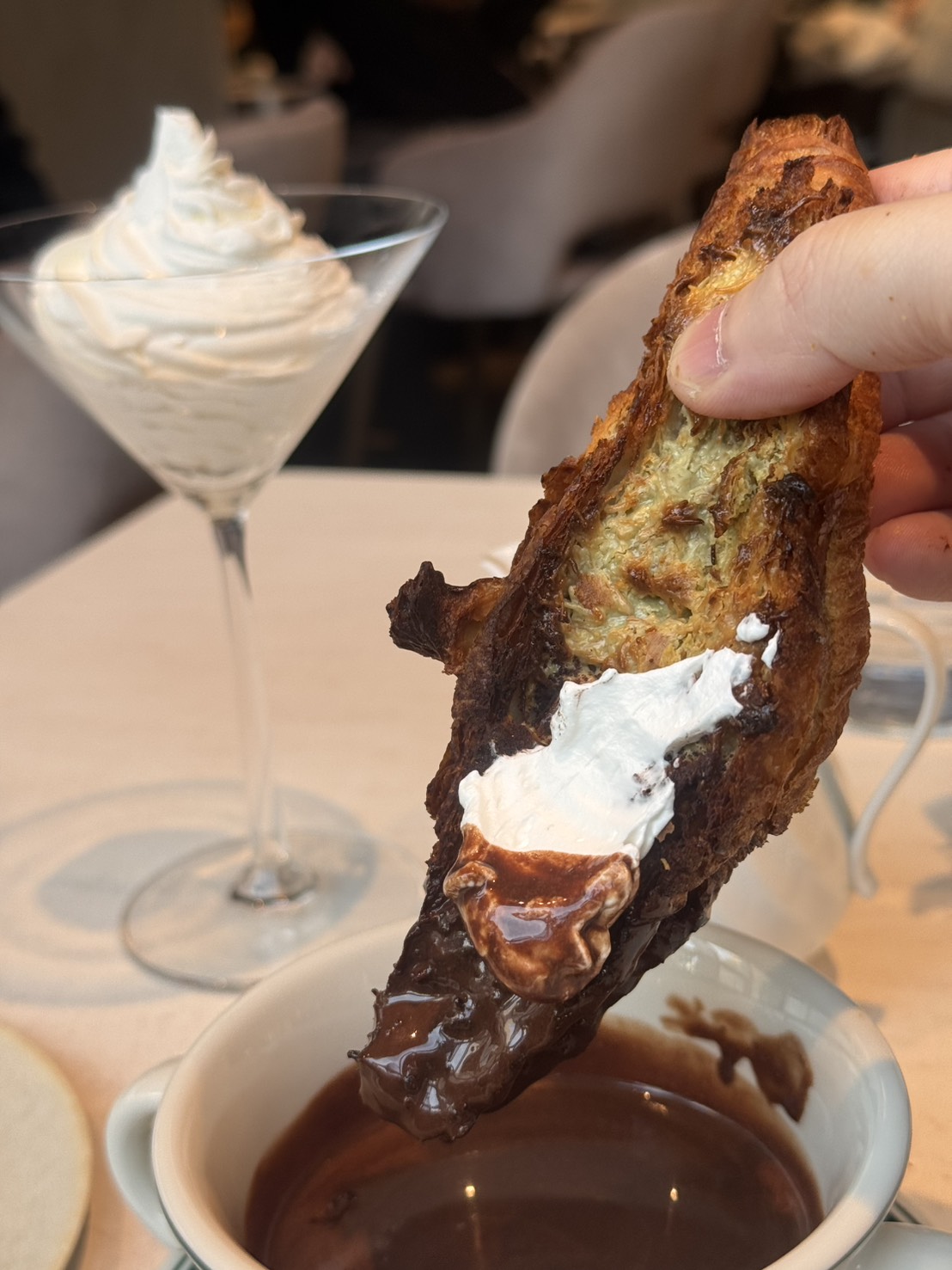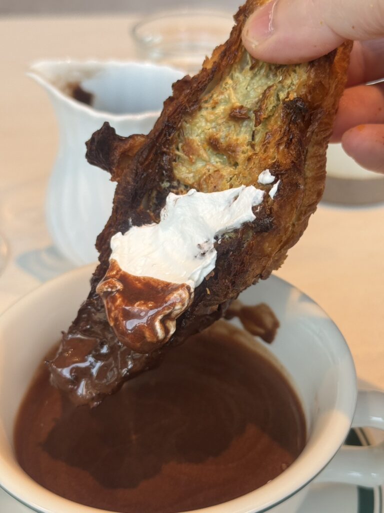 ホイップクリームを乗せて、ショコラショーに浸していただきます。