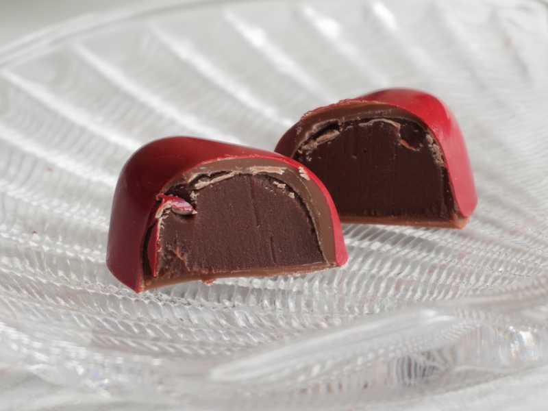 和歌山県産の青梅と紫蘇梅を使用したガナッシュ。梅の甘みや酸とガナッシュのバランスが素晴らしい。少量のアーモンドシロップを加えることで和素材にヨーロッパのニュアンスを添えたのもポイントとのこと。