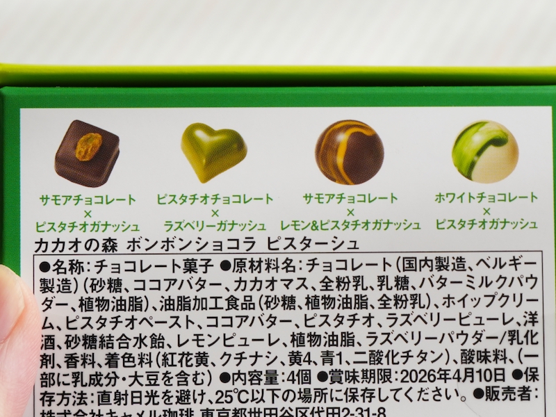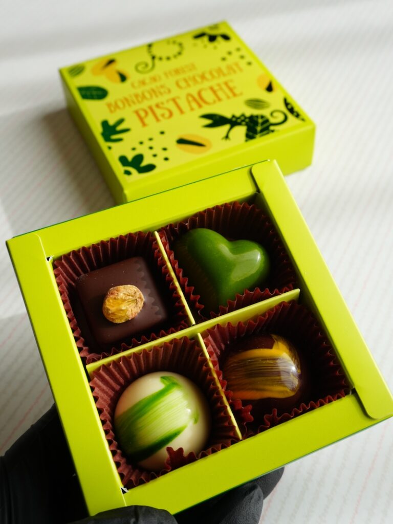 まず前提として、これは“ピスタチオだけで押し切る”アソートではありません。ピスタチオを軸にしつつ、ラズベリーやレモンなどを合わせて、4種それぞれキャラを変えています。ひと粒で完結させるというより、4粒で一箱のストーリーを作っている感じです。