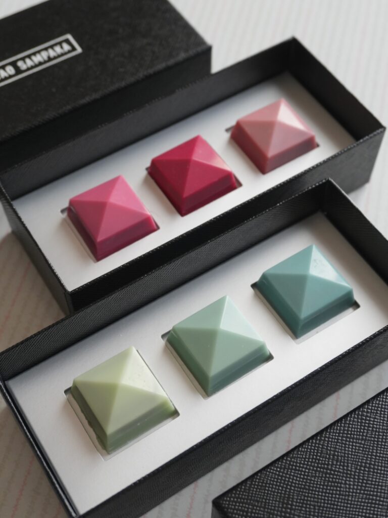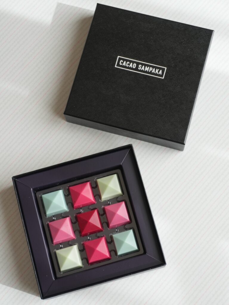 宝石のような艶のあるボンボンショコラ。ベルデセレクションはライムのガナッシュ「リマ」、ココナッツ×パイナップルの「ココ イ ピニャ」、ペパーミントの「メンタ」で爽快寄り。ララセレクションはローズの「ロサ」、ピスタチオに弾ける食感を足した「ピスターチョ ペタセタ」、そして「カラメロ パッションフルーツ」。気分で使い分けできる2箱紹介がいちばん映えます。