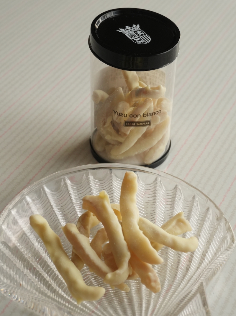私のイチオシがこちら。和歌山県産の柚子ピールをホワイトチョコでコーティング。噛んだ瞬間に立つ柚子の輪郭がハッキリ出ます。
