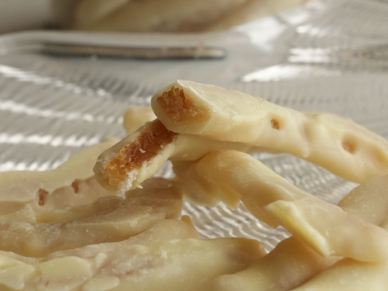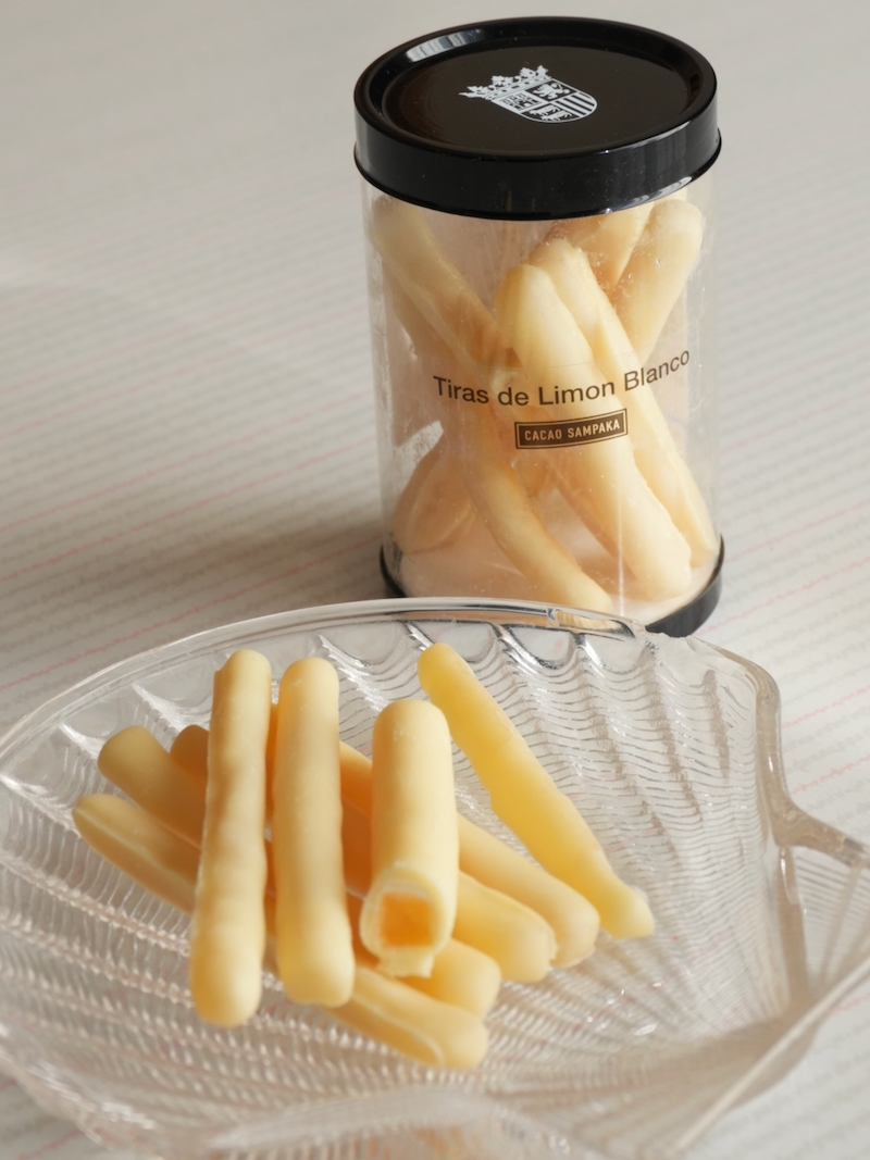 レモンピールをスペイン産ホワイトチョコでコーティングした、酸味と甘味のバランス型。レモンピールが主役で、香りがスッと抜け、濃厚なホワイトチョコレートと相まって行きます。食後に1〜2本つまむと口の中がリセットされる感じがあって、濃いチョコの合間に挟む役としても優秀。手が止まるというより、手が伸びるタイプです。