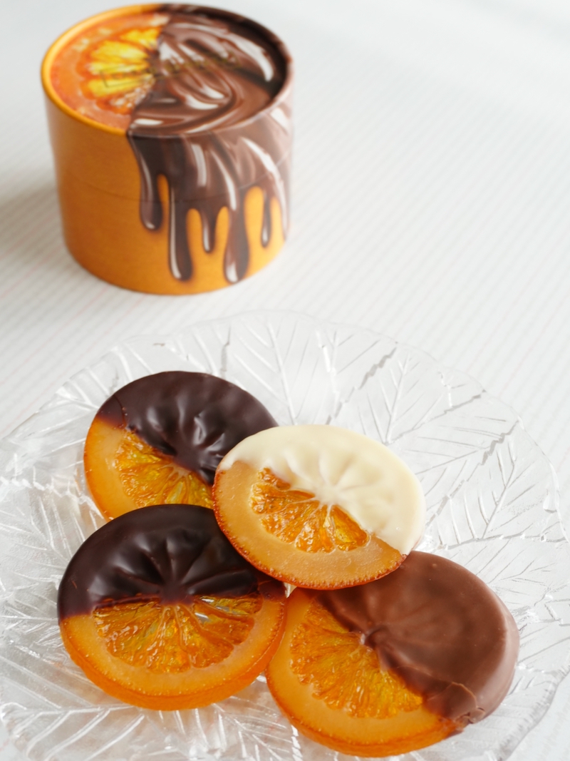 バレンシアオレンジをチョコでコーティングしたオレンジスライスで、果肉感とチョコのなめらかさの組み合わせが軸。4枚の内訳が、ダーク60%が2枚、ミルク35%が1枚、ホワイト28%が1枚。まずはダークで柑橘の酸味を締め、ミルクで丸め、ホワイトでデザート寄りに着地…みたいに流れが作れます。紅茶とも相性が良いです。