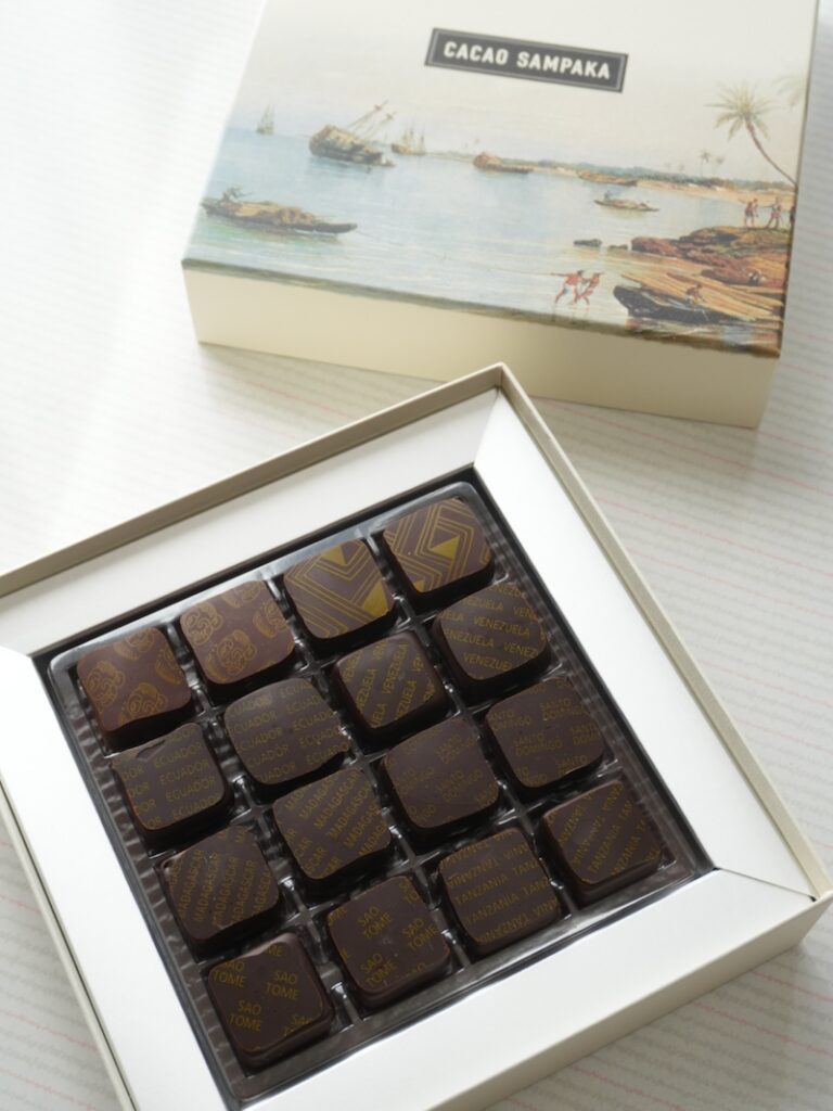 カカオサンパカの原点と呼ぶべきアソート、“カカオの産地の違い”を体験できる、食べ比べ特化の16粒。ショコヌスコ、カメルーン、エクアドル、ベネズエラ、マダガスカル、サントドミンゴ、サオトメ、タンザニアの8種が各2個で、同一産地のクーベルチュールで作ったガナッシュを同じ産地のチョコでコーティングするというこだわり方です。リーフレット付きなので、読みながら食べると解像度が一気に上がります。