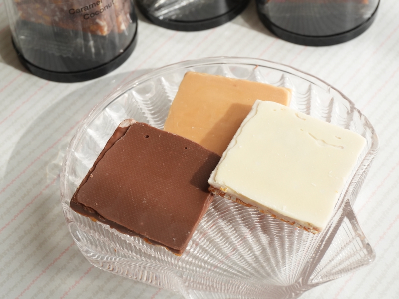 ココナッツはミルクチョコベースにココナッツを練り込み、甘さの中で爽やかさが立つタイプ。フルーツはホワイトチョコベースにラズベリーとイチゴを入れて、酸味が前に出やすい。ソルトはブロンドチョコに塩を効かせて、キャラメルのコクを締める方向。