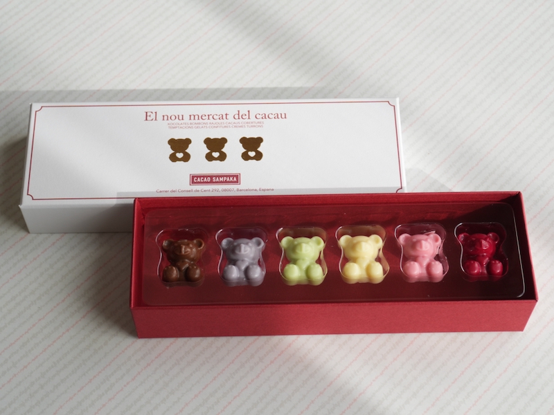 クマの缶が可愛い。胸のハートが立体で、食べ終わったあとも小物入れに使えます。中身は“つまみながら楽しい”構成で、ミニベア3種が各2個、キャラメル トゥロン3種、オレンジチョコレートの「ショコラタ ナランハ レチェ」1枚、さらにレモンピールの「ティラ デ リモン ブランコ」3本入り。カカオサンパカのチョコレート菓子を様々なカテゴリで楽しめるもの魅力です。