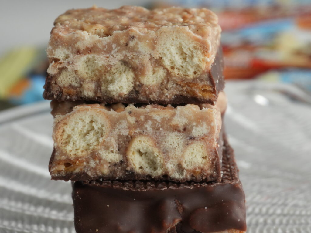 外側は上半分がクリーミーなバニラ風チョコ、下半分がいつものビターなチョコで二層になっていて、見た目からすでに楽しい。中にはワッフルクランチ、ザクザクビスケット、ココアクッキーが入っていて、食感の層がすごいんです。