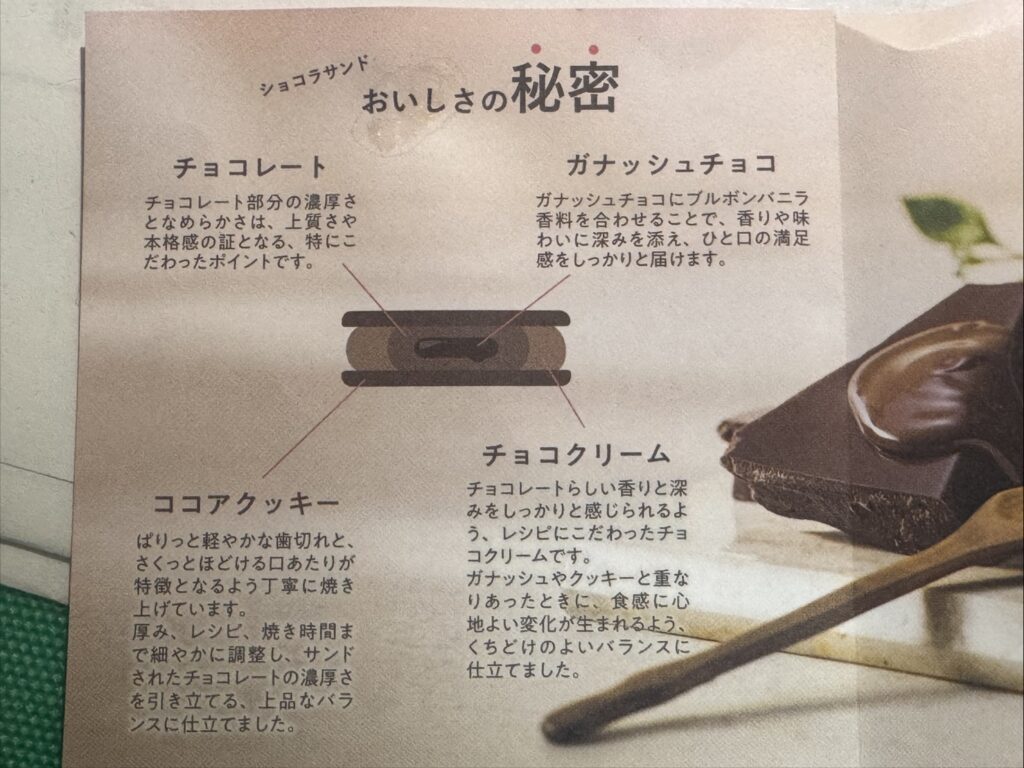 先ほどの写真からでは3種のチョコレートと聞いてイメージ湧かないかもしれません。この説明書きを見れば1発で理解できますね。チョコクリームの中に、チョコレートとガナッシュが入っているイメージです。ものすごく手が込んだショコラサンド。3種のチョコレートのパーツが合わさることで複雑な美味しさが広がります。