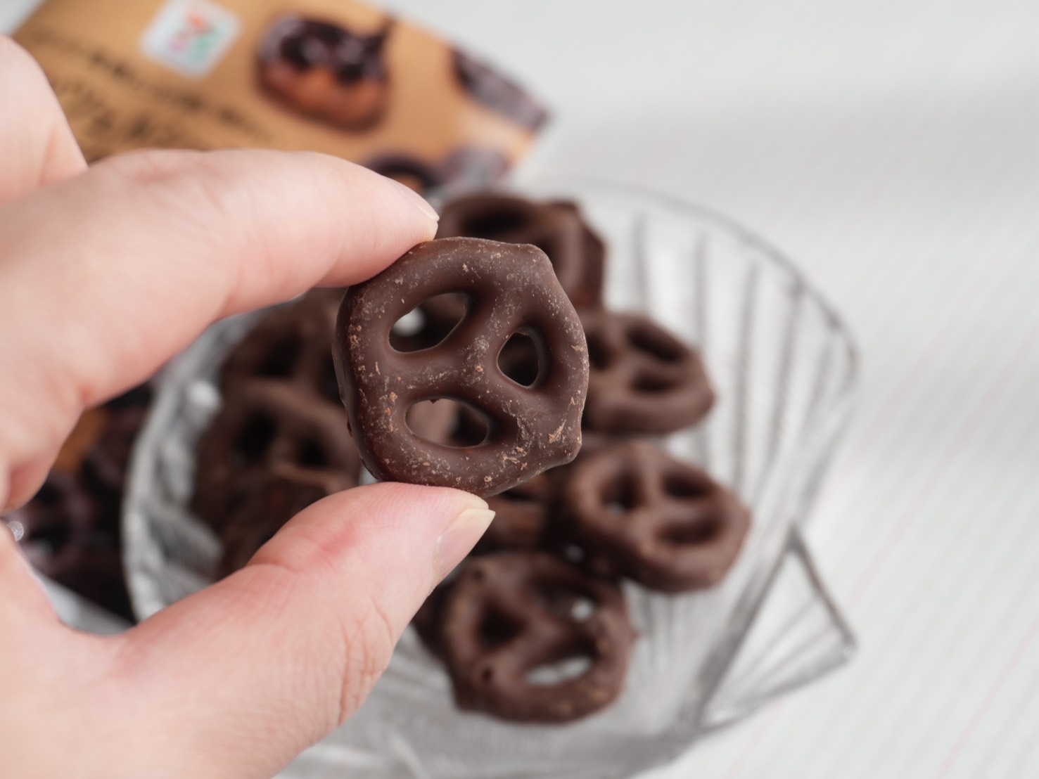 パッケージはブラウン基調の落ち着いたデザイン。プレッツェルにビターチョコレートがかかっている様子がシンプルに描かれていて、店頭でも目を引きます。開封するとひと口サイズのツイスト型プレッツェルがたっぷり。チョコレートは濃いブラウンで艶があり、食欲をそそります。